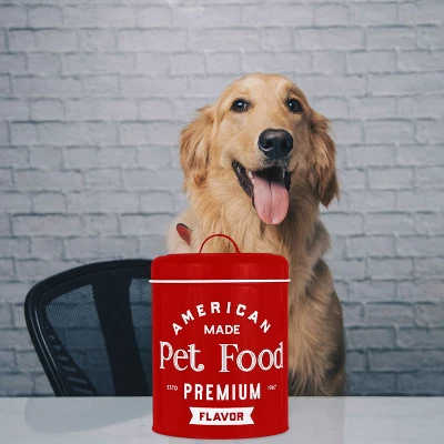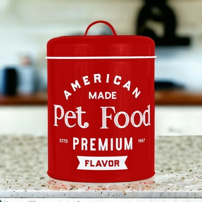 - FUNCTION AND FASHION – This metal food or treats canister features a red coated finish with white accents