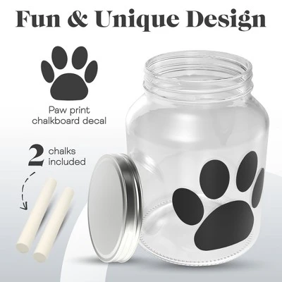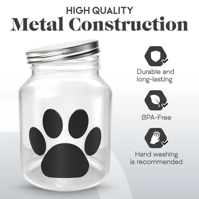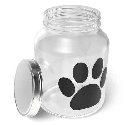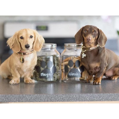 Amici Pet Buddy Paw Medium Glass Storage Canister features a paw print chalkboard decal. A metal, twist lid tops this canister, which includes two pieces of chalk to immediately label the contents. A 108-ounce capacity allows this canister to safely house your pet’s favorite food, treats, toys, and other essentials with ease. To best maintain its beauty and functionality, hand wash with care. To complete this set, a matching 140-ounce Capacity canister is also available in this collection.