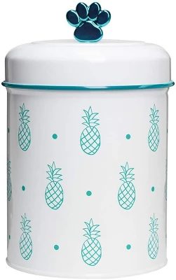 Pet treat storage meets chic home décor in the Amici Pet Pineapple Medium Metal Canister. This fun metal storage canister features a white powder coat base on a cylindrical shape with a whimsical pattern of evenly-spaced metallic turquoise pineapples and polka dots. The gasketed lid is lined with a shiny metallic turquoise edge with a matching paw shaped knob at the top. This collection has two sizes: the smaller of the two canisters with a capacity of 64 fluid ounces and a large one with 140 ounces. Food safe, this metal food storage canister will add a touch of personality to your countertop. It is recommended that this metal canister be hand washed with care.