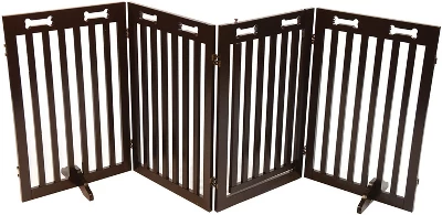 - These freestanding adjustable doggie gates measure up to 80 inches wide when fully extended.