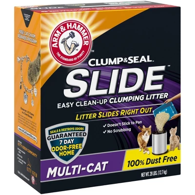 It’s time to end scraping and scrubbing with Arm & Hammer SLIDE Easy Clean-Up Clumping Litter. Our revolutionary formula means the litter slides right out of the litter box, making cleanup easy. Plus, Clump & Seal technology seals and destroys odor for a 7-Day Odor-Free Home, Guaranteed. Fellow cat lovers like you put their trust in ARM & HAMMER. Join them and see how quick and easy clean-up can be!