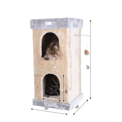 The Armarkat model X3203 Premium cat tree is Cat Daddy Approved by noted cat behaviorist Jackson Galaxy. Your kitties can enjoy hours of play in the double condo.F and B Bullet:Armarkat Multi-function Cat house with double Spacious Condo.Made of wood, faux fur carpet. Scratching board allow your felines to scratch from any angles as they like.The tower is perfect for cat to sit and observe their surroundings.Dimensions:Base Dimensions:15″ x 15″;. Playhouse Dimensions:15″(L) x 15″(W) x 32″(H). Six-month warranty included.Replacement parts available from the manufacturer.