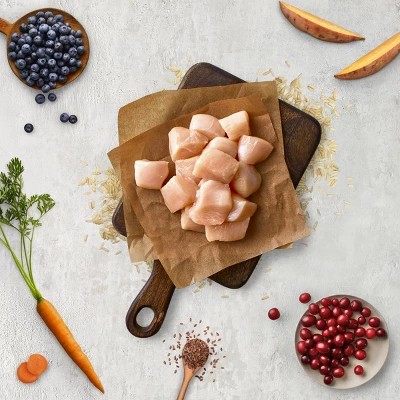 - REAL MEAT FIRST: Blue Buffalo foods always feature real meat as the first ingredient. High-quality protein from real chicken helps your dog build and maintain healthy muscles. Plus they contain wholesome whole grains, garden veggies and fruit.