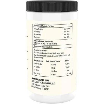 Our Bone Broth is the best way to encourage your dog or cat to eat kibble and stay hydrated. Is your cat or dog a picky eater? Our beef bone broth topper is loved by even the pickiest eaters. Add powder directly onto pet food or mix well with warm water. Human grade grass fed beef bone broth, simmered and slow cooked to maximize nutrient content and flavor. At Left Coast Performance, we’re known for offering premium products at reasonable prices. Get 90 servings for a dog or cat 25lbs or smaller for less than $0.23 per serving.