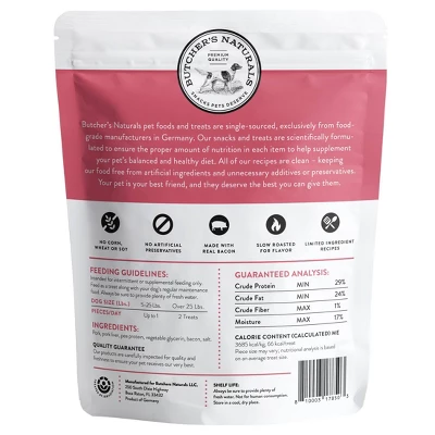 The Butcher’s Naturals Pork & Bacon Jerky Treats for dogs, are single-sourced, exclusively from food- grade manufacturers in Germany. Our treats are scientifically formulated to ensure the proper amount of nutrition is in each item to help supplement your pet’s balanced and healthy diet. Pork is the #1 ingredient in these delicious healthy treats to satisfy your dog’s craving. Your dog will do anything for these tempting, pork & bacon treats. When your furry companion has been good, or you just want to show your pet some love, your dog will all but beg for these Butcher’s Naturals Pork & Bacon Jerky Treats. All our recipes are clean – keeping our food free from artificial ingredients and unnecessary additives or preservatives. They are free of corn, wheat, and soy, so you can be assured your pet is getting only the best, pure ingredients for your high-quality standards and his safety. Our treats are slow roasted to lock in the flavor, so each treat tastes scrumptious for your furry friend. Your pet is your best friend, and they deserve the best you can give them.