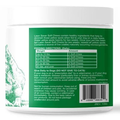 Get rid of grass burn once and for all with Chew + Heal Grass Burn Lawn Protection Dog Supplement. This made-in-the-USA canine supplement helps eliminate the causes of grass burn. It’s packed with amino acids, probiotics, digestive enzymes and B complex vitamins designed to lower nitrogen and improve the alkaline-acid balance of your pooch’s pee. Plus, natural ingredients like yucca and protease from papaya help lower nitrogen levels in your doggo’s poo to help reduce stool odor. Enjoy greener grass this season and a fresher-smelling lawn!