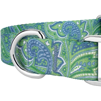 Enjoy this sophisticated Green Paisley Premium Dog Collar from Country Brook Petz. Featuring a classy blue and green paisley design, you’ll feel debonair while sporting this pattern. Printed using our colorfast dye, our collars will not run or bleed. Created from superior hardware and webbing, Country Brook Petz’ Green Paisley Premium Dog Collars will not only provide your pup with a trendy collar, but will give you a sense of ease when using our products.Country Brook Petz’ premium patterned collars are vibrant, comfortable collars made right here in the U.S.A. These collars are constructed using strong polyester webbing, dependable metal side release buckles that feature a brilliant mirror finish, heavy-duty wide-mouthed triglides, and heavy welded D-rings. Our polyester collars are ribbed, soft, and sleek to the touch with a little bit of a sheen. Country Brook makes all their collars after the order has been placed. However, rest assured as your collar will ship within two business days of receiving payment.We want your furbaby to be able to show the world their new collar immediately, so be sure to measure for the right size. You can check this out by using a string, or tape measure, to see where the collar will fit snugly and comfortably on your dog’s neck. These stylish prints work well with both boy and girl puppers.