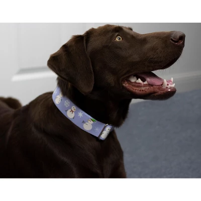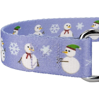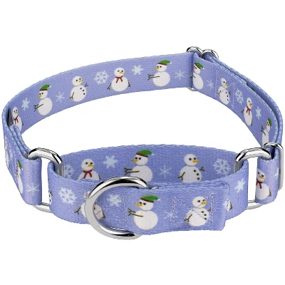 Is your escape artist slipping out of their collar? Martingale collars are designed to prevent your pup from pulling out of their collar by tightening around your dog’s neck whenever they try to remove their heads. Once your dog quits pulling, the collar relaxes again. Perfect for training, the twin-loop design gives you control over your stroll. The martingale collar is often referred to as a humane choke collar because it naturally limits how much it tightens, ensuring your dog’s safety. A no-slip, adjustable, limited choke collar is an excellent solution for sighthounds who slip out of their collars.Enjoy our frosty delight with this Martingale Dog Collar. There must have been some magic when our designers came up with this festive print because your pup will dance around when you place this collar upon their neck! A cool background surrounds cute, whimsical snowmen. Martingale Dog Collar is the perfect addition to your pup’s holiday attire. Printed using state-of-the-art colorfast inks, our collars will not run or bleed. Crafted from industry-leading hardware and webbing, Country Brook Petz’ Snowman Martingale Dog Collars stand up under tough conditions, all while keeping your furry friend looking fab.By adjusting the metal slide, you give slack to the loop. Slip it over your dog’s neck and decrease size until you can comfortably slip only two fingers under the collar. The unique limited closure prevents the choke from becoming too tight. We at Country Brook Petz pride ourselves on only using the best hardware, and you can rest assured that these collars will withstand whatever your pup gets into. Our collars have wide-mouthed heavy-duty triglides for easy adjustment and heavy-welded D-rings for strength.