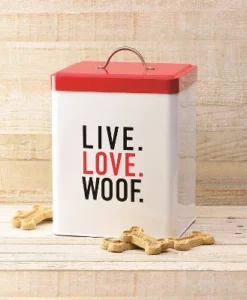 Amici Pet Live Love Woof Metal Storage Canister, 208 Oz. , White Red Black