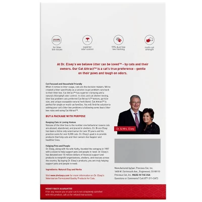 Dr. Elsey’s Cat Attract Litter is the problem cat training litter! This scoopable litter provides a solution for cat owners whose cats do not use their litter box. Blended with a natural herb attractant, Cat Attract’s herbal scent, ideal texture and particle size combine to solve litter box problems. Non-use of the litter box is the number one reason a cat is abused or finds itself in a shelter. Cat Attract is the first cat litter to specifically address problem cats. Each box has a free Litter Box Solutions Booklet to help cat owners solve their litter box problems.