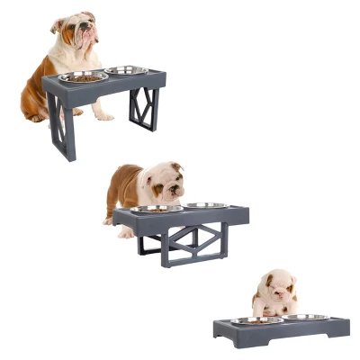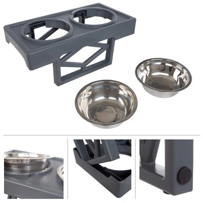 - PRODUCT DETAILS – Materials: PP and Stainless-Steel. Dimensions: (L) 19” x (W) 10” x (H) 2.75” – 12”. Dog Bowl Set Holds 34oz Each. Set includes: 1 Dog Food Stand and 2 Dog Bowls. Color: Gray.