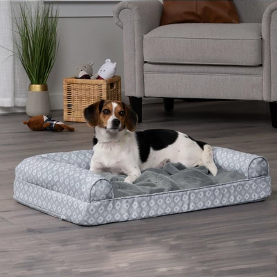 Perfect for pets young and old, the Furhaven Plush & Diamond Print Nest Top Sofa-Style Dog Bed is designed to provide your loved one with maximum comfort for a good night’s rest. Featuring a loose, snuggly soft ‘blanket’ top that dogs wouldn’t be able to resist burrowing and nestling into for the ultimate snuggling comfort. Your dog will be more snug than a bug in a rug! The orthopedic (egg crate) foam base supports your pet’s joints, cushions pressure points, and helps improve air circulation for optimum rest. The Jumbo Plus option, for larger breeds, features a solid slab orthopedic foam for greater support and comfort. They’ll love the bolsters’ soft but supportive feel provided on three sides, giving them a variety of cozy positions to snuggle into. The zippered cover is easily removed and machine washable for your convenience. Low profile, step-on design for easy access by older or disabled pets. Easy to clean.