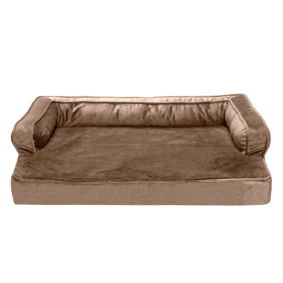 Perfect for cats and dogs of all ages, the FurHaven Comfy Couch pet bed is a short-sided pet sofa that is sure to be your pet’s favorite new snuggle spot. The orthopedic mattress features egg-crate foam with a peak and valley design for optimum air flow, circulation, and pressure point relief for your pet. Soft sided velvet walls provide bolstered support on both edges and the back of the bed, allowing your pet to relax into comfort with their back and hips supported. The side bolsters also offer the perfect pillow for your pet to rest its head, allowing for better spinal alignment and neck relief. Bolsters are filled with 100% recycled fluffy fill. With a faux fur sleep surface that is oh-so-soft on noses and paws, you pet will drift off to sleep in comfort. The cover is easily removed and machine washable for your convenience.