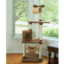 Armarkat 64″ Real Wood Cat Tree With Scractch Sisal Post, Soft-side Playhouse, A6401, Almond