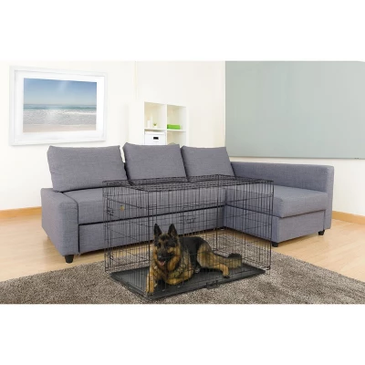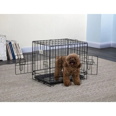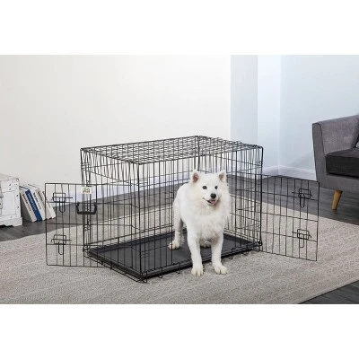 A durable, easy-to-clean crate for your precious pups. This crate’s quick-fold design means it takes just seconds to set up a safe and secure environment for your furry friends. This product comes with a divider to give less space while crate training a growing puppy and features both front and side doors for added convenience. A carrying handle makes it easy to move this crate room to room and when you’re ready to store it away, break your crate down as quickly as you set it up—no tools necessary. The XXXL size crate has a metal tray. XS: 19″L x 12.75″W x 16″HS : 24″L x 18″W x 20″HM: 30″L x 21″W x 23″HL: 36″L x 24″W x 26″HXL: 42″L x 28″W x 30″HXXL: 48″L x 29″W x 32″HXXXL: 54″L x 37″W x 39″H