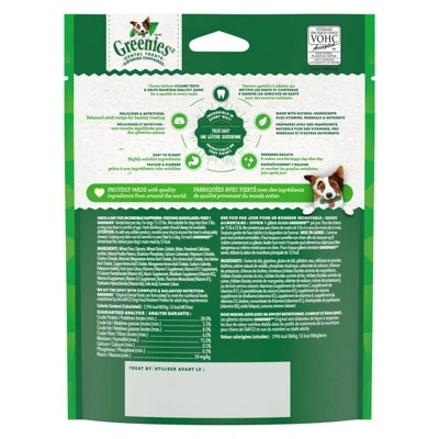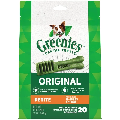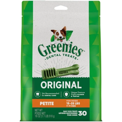 One GREENIES Original Dental Treat a day is all it takes for clean teeth, fresh breath and a happy dog. Your dog can’t wait to sink their teeth into these delicious, original-flavor dental dog chews because they feature a delightfully chewy texture that fights plaque and tartar. Irresistibly tasty and incredibly powerful, GREENIES Treats for Dogs are recommended by veterinarians for at-home oral care. Best of all, these natural dog treats are made with highly soluble ingredients that are safe and easy to digest. Give your dog the mouth-wowing treat that helps promote their overall health with GREENIES Dog Treats. Great for smalls breeds and dogs between 15 and 25 pounds.