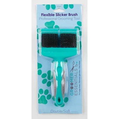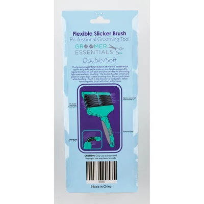 The Groomer Essentials Double/Soft Flexible Slicker Brush significantly reduces the strain on your hands compared to regular brushes. Its soft pads and pins are ideal for eliminating light mats and daily brushing. The double-headed slickers are great for larger dogs to save brushing time. Do not push down while brushing. Brush in the direction of the handle. When removing mats, brush with short, soft strokes.