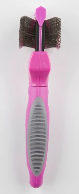The Groomer Essentials Single/Medium Firm Flexible Slicker Brush significantly reduces the strain on your hands compared to regular brushes. This brush is perfect for double-coated breeds to easily remove loose undercoat which reduces shedding. The single-headed slickers are great for smaller dogs and hard to reach areas. Do not push down while brushing. brush in the direction of the handle. When remove mats, brush with short, soft strokes.