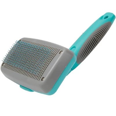 Slicker brushes have fine, short wires close together on a flat surface. They are used on medium-to-long-haired or curly-haired dogs to remove mats. The Groomer Essentials Self Cleaning Slicker Brush is designed with rounded, scratch free pins to safely and gently remove tangles and excess fur. The non-slip rubber grip helps to reduce fatigue. One click of a button and the pins retract allowing you to simply wipe away the excess fur.