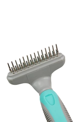 Undercoat rakes for dogs have specially designed teeth that strip the dead hair and the shedding undercoat while leaving the top coat undisturbed. Using an undercoat rake prior to or during bathing usually helps reduce shedding so you can keep those fur piles contained. The Groomer Essentials Double Row Undercoat Rake is designed with rounded, rotating pins that reduce hair pulling to comfortably glide through tangled coats. The round tipped pins are spring-mounted to gently massage pets’ skin. Its designed with two rows of pins for thick undercoats.