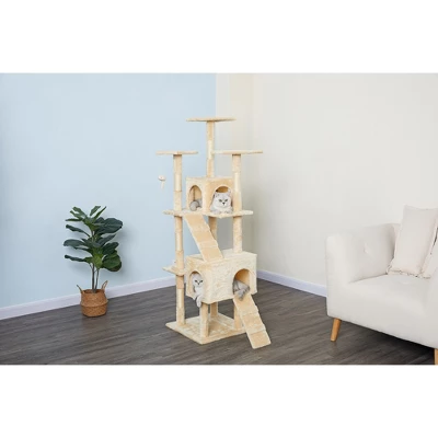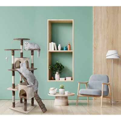 An affordable cat tree with all the perks! This piece is an excellent option for single or multi-cat families. Level after level of feline fun, equipped with condos, ladders, perches and a hanging toy. Your cat will love climbing about their kitty empire, napping, playing, and scratching the natural sisal scratching posts. |Overall Size : 32″W x 21″L x 63″HBase Board Size : 19″W x 19″LSize of Big Condo : 17.75″W x 11.25″L x 11.25″HSize of Top Condo : 11″W x 11″L x 9.75″HTop 3 Perches : 10.75″W x 10.75″L