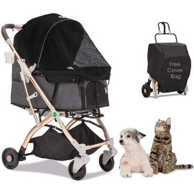 - “-ERGONOMIC LIGHT-WEIGHT DESIGN This light-weight pet buggy is made of rust-free aluminum in anodized gold color. Front and rear canopy openings provide viewing flexibility. 2 front-wheel suspension and PU-leather handlebar made traveling with pets enjoyable. No assembly required, just snap the wheels, and it’s ready to go. “