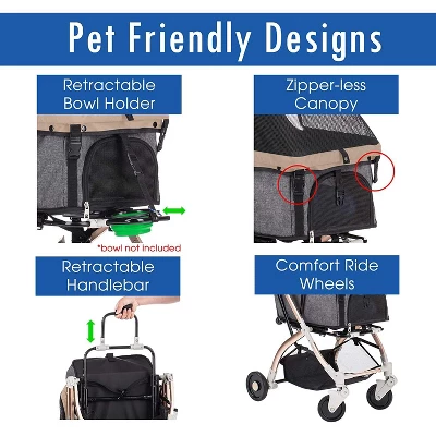 - -PET-CENTRIC DESIGNS This premium pet stroller features a retractable meal bowl holder to feed your pets at any time, and two tethers in the basket buckle your pets in snugly. It also includes two machine-washable carrier pads and durable water-resistant fabric. Three organizer pockets and a large under-basket made traveling easy and tidy.
