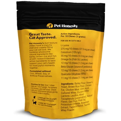 Pet Honestys Immune Support Lysine for cats is a delicious, dual-textured supplement that contains amino acids, prebiotics, antioxidants, & more to promote a healthy immune and respiratory system. Powerful ingredients like Lysine, Colostrum, and Quercetin work together to support immune & respiratory health as well as their gut, digestion, skin, & overall health. The unique texture format pairs a crunchy outer shell with a creamy, savory filling, offering a taste and texture combination that cats love. Give 1 chew per 1LB of body weight. For kittens 4-6 months, give half a dose. Consult your veterinarian for kittens under 4 months.