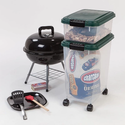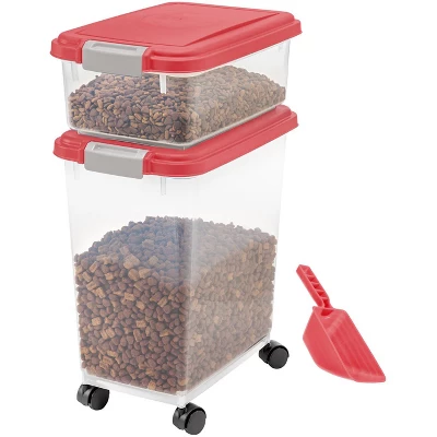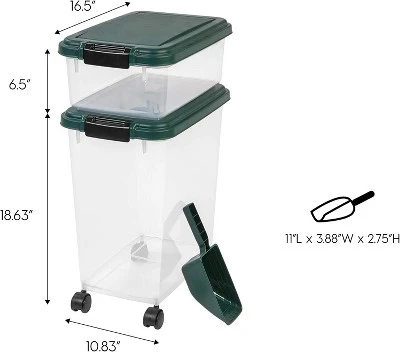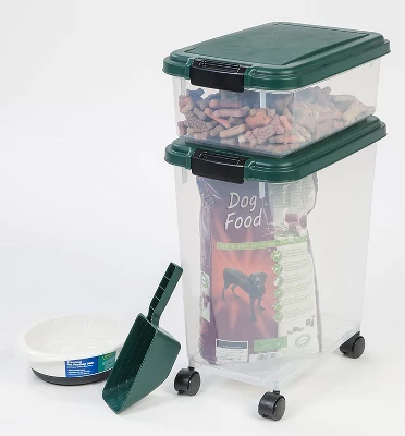Meet the airtight container designed with your pet in mind. This plastic airtight container combo includes a 33 quart sealed storage container, a 12 quart sealed storage container, and a matching 2-cup food scoop to easily measure out your dog food, cat food, or any other pet food you want to store. Both airtight storage bins feature a foam seal and snap lock latches to keep contents fresh and keep pests out. Designed as pet food bins, these BPA free rolling storage bins offer many other uses as well such as leash and toy storage, wood pellet storage, grain storage, birdseed storage, cat litter storage, or even as a charcoal container. The small food storage bin neatly stacks on top of the large one, and the translucent bodies allow content levels to be checked at a glance. This IRIS 3-piece airtight pet food container combo is versatile, functional, and the casters allow for easy mobility in any area of the house.