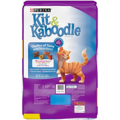 Feed your friendly feline a taste she loves when filling her bowl with Purina Kit and Kaboodle Original adult dry cat food. This tasty blend of four delicious flavors — chicken, liver, turkey and ocean fish — offers 100 percent complete and balanced nutrition designed especially for adult cats, all with a taste she craves throughout the day. With no room for bowl boredom, this nutritious blend offers a variety of shapes — four to be exact — to couple with its cat-thrilling combination of palate-pleasing goodness. Give yourself peace of mind knowing your furry friend is gaining the daily nourishment she needs while also making mealtime an adventure when you supply her with this adult cat food kibble. It really is the whole kit and kaboodle. Stop the comparison shopping; when you order Kit and Kaboodle Original, you’re providing your pet with a Purina cat food that’s backed by over 90 years of research and innovation from a brand you can trust.