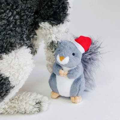 - This plush furry squirrel is Christmas themed with its Santa hat.