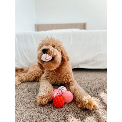 - A set of 6 Valentine-themed plush dog ball toys.