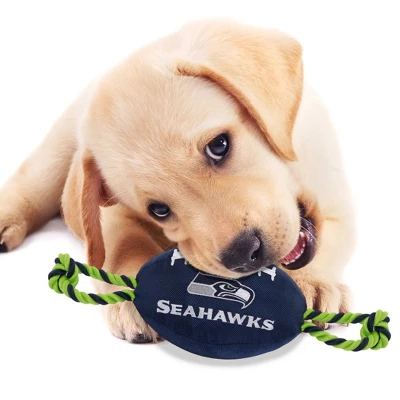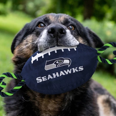 Get your furry friend ready for gameday with the Pets First NFL Football Rope Dog Toy. Officially licensed by the NFL, this faux football is made of durable nylon and features an embroidered team logo. It’s designed with colored rope on either side to provide pet parents with a better grip during tug-o-war and also has a squeaker on the inside to keep your pup interested. Show off your team spirit and give your paw-tner a fun fetch or tug plaything with the Pets First NFL Football Rope Dog Toy.