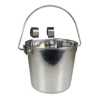Stainless Steel Pail With RivetsOur Flat-sided Stainless Steel pail now comes with riveted handles. These riveted handles provide extra support and make it easy to carry water! Flat-Sided for perfect hanging. They hang flush against fences, crates, kennels or exercise pens without rolling or tipping. Our Flat-Sided Pails come with an attached hook that helps lock it onto the wires of the kennel. Ideal for kennels, run, or exercise pens!