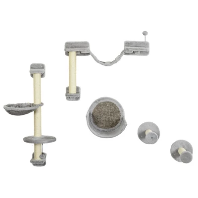 - Multi-level Fun: This cat shelf set features multiple platforms, a hammock, a spring teaser ball, a semicircular cat perch, two scratching posts, and soft ladders to satisfy your cat’s need to jump, climb, scratch, and relax, making it an entertaining addition to your home.
