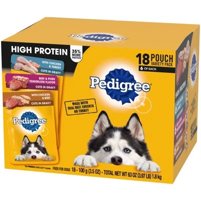 - CONTAINS: Six (6) 3.5 oz. pouches of PEDIGREE High Protein Wet Dog Food Pouches, with Chicken and Beef Cuts in Gravy, six (6) 3.5 oz. pouches of PEDIGREE High Protein Wet Dog Food Pouches, Beef and Pork Tenderloin Flavor Cuts in Gravy and six (6) 3.5 oz. pouches of PEDIGREE High Protein Wet Dog Food Pouches, with Chicken and Turkey Cuts in Gravy