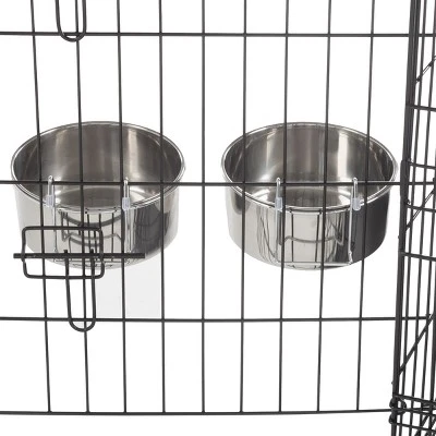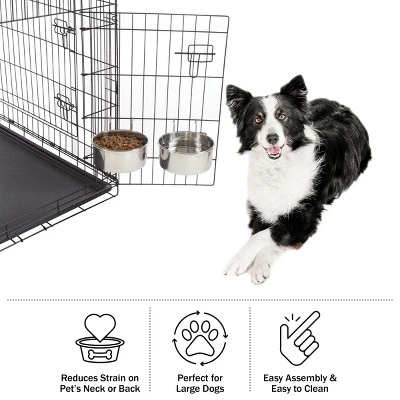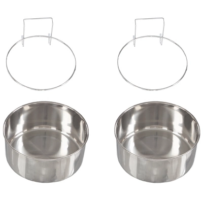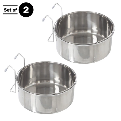 - Featuring a base around the rim of the bowl and wire hook brackets, the set of two 50.4oz dog bowls can attach to pet crates, cages, or even chain link fences