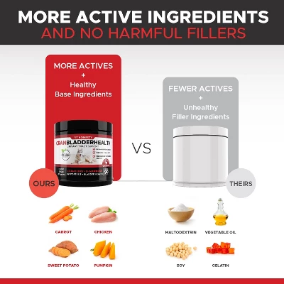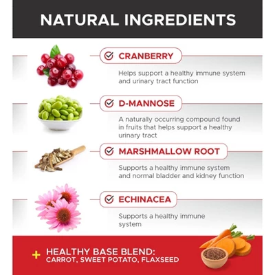 Pet Honesty’s Cranbladder Health soft chews help support normal and healthy kidneys, and promote bladder and urinary tract health. These delicious soft chews dogs help improve kidney and bladder function by keeping pH levels balanced and supporting normal renal function. Made from naturally derived ingredients like cranberry, echinacea, and marshmallow root, the vet-recommended supplements have a delicious taste your dog will love!