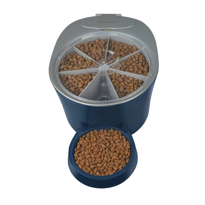 Enjoy your weekend getaway — no cat sitter required. The PetSafe® Six Meal Pet Feeder makes sure your pet is fed on time, every time. This automatic feeder has 6 tray slots, plus 1 meal that is exposed and ready-to eat. Each tray compartment holds 1 cup of dry food. The capacity of the feeder makes it perfect for cats and small dogs. You can schedule any combination of 1-6 meals per day for your cat or dog using the digital clock with LCD display. You are able to select the time your pet is fed in 15-minute intervals. Once the schedule is set, your pet’s meals will automatically be served at the same time each day. When it’s time for your pet’s next meal, the tray will rotate and dispense your cat’s food into the bowl. If your pet tends to eat their food too quickly, or if you want to help manage your pet’s weight, use this feeder to schedule smaller meal portions to keep your best friend healthy. If you want to dispense a meal earlier than scheduled, simply press the Feed Now button on the display. If you need to stop scheduled meals for a brief time, use the Sleep Mode function. Using Sleep Mode will save your pet’s programmed meal schedule and preserves battery life. The clear, locking lid keeps your pet’s food fresh and keeps prying paws from sneaking food ahead of schedule. The lid also lets you see how much food is left in your pet’s feeder, so you know when you need to refill it. When it’s time to clean the feeder, place the BPA-free bowl and tray carousel in the top rack of the dishwasher and clean the other components with a damp cloth. Trust PetSafe® to help keep your pet healthy, safe and happy.