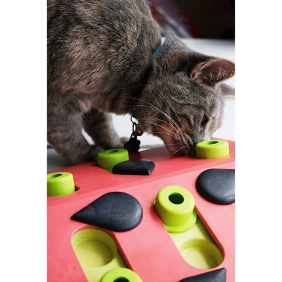 Your smarty cats will love the challenge of the Melon Madness Puzzle & Play by Nina Ottosson. Cats bat at the pegs and swivel the seeds to uncover the 6 hidden treat compartments. Adjust the difficulty of the puzzle to make it easier for beginners or more challenging for super smarty cats. Each puzzle comes with a Tips and Tricks info sheet to help you get the most out of your puzzle. Replace your standard bowl and feed your cat from the puzzle to engage their natural hunting and foraging instincts. The puzzle holds up to 1/4th cup of food, and is made with food safe materials that you can trust with your kitty.