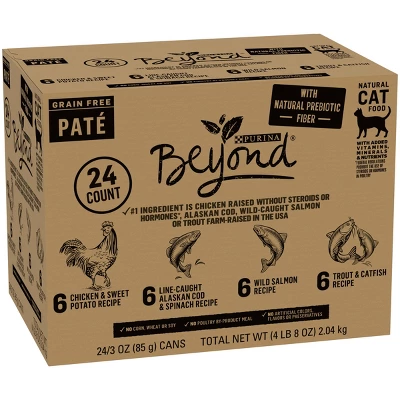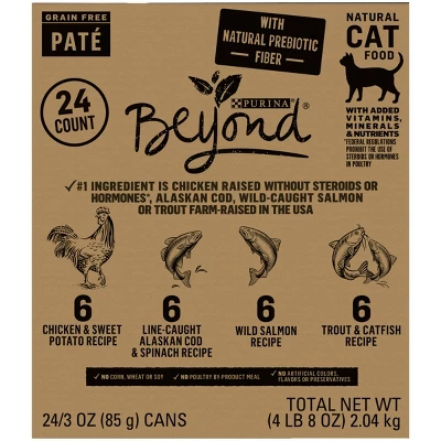 - Twenty-Four (24) 3 oz. Cans – Purina Beyond Cat Food, Natural with added vitamins, minerals, and nutrients Pate Wet Cat Food Variety Pack, Grain Free