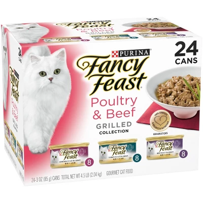 Turn mealtime into a feast with 100 percent complete and balanced Fancy Feast Grilled Poultry and Beef Collection in Gravy Canned Cat Food. With real poultry and beef and added vitamins and minerals, this Fancy Feast grilled cat food supports your catโs overall well-being while delighting them with a savory Fancy Feast wet cat food meal made without artificial colors or preservatives. Give your feline companion a cat food with gravy offering the high-quality gourmet ingredients they deserve; give your cat Fancy Feast Grilled Poultry and Beef in Gravy Canned Cat Food.