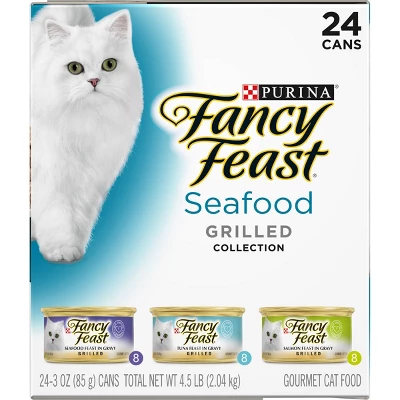 Turn mealtime into a feast with 100 percent complete and balanced Fancy Feast Grilled Seafood Collection in Gravy Canned Cat Food. With real seafood and added vitamins and minerals, this Fancy Feast grilled cat food supports your catโs overall well-being while delighting them with a savory Fancy Feast wet cat food meal made without artificial colors or preservatives. Give your feline companion a cat food with gravy offering the high-quality gourmet ingredients they deserve; give your cat Fancy Feast Grilled Seafood Collection in Gravy Canned Cat Food.