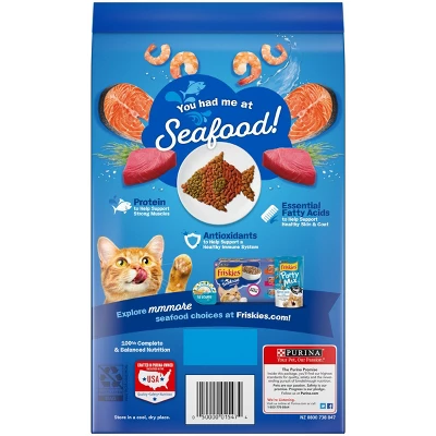 Pour a purr-worthy dish full of yum with Purina Friskies Seafood Sensations dry cat food. Salmon, tuna and shrimp flavors combine to create a taste she’ll love, and a touch of seaweed flavor balances out the recipe for delicious goodness. Essential vitamins and minerals in every serving let you feel good about offering this dry cat food to your feline friend, and the seafood flavors give her plenty of reasons to finish every last delectable bite. Each serving contains 100% complete and balanced nutrition for every stage of life, so your cat can enjoy this scrumptious recipe from her playful kitten days all the way through her adventurous adult years. Let the sound of the delightful bites hitting her bowl send her prancing your way, and watch as she savors every bit of the ocean flavors. With so much goodness in every serving, she’s sure to meow for more at mealtime.