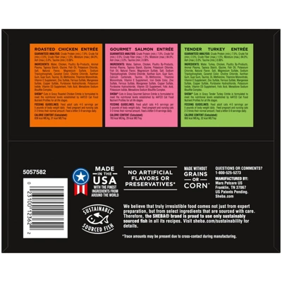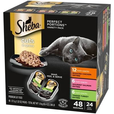Your cat knows what they want, and knows how to get it. Give them SHEBA Wet Cat Food. Each SHEBA Cuts in Gravy recipe is made with real protein, essential vitamins, and minerals, so it’s as nutritious as it is delicious. This wet cat food is made without corn and artificial flavors or preservatives; and since it’s so delectable and easy to chew, your cat will devour every tasty bite. SHEBA PERFECT PORTIONS Cuts in Gravy Wet Cat Food offers two convenient servings in right-sized trays to ensure freshness without leftovers. Show your cat some love; whether your fancy feline is a kitten, adult, or senior cat, this soft wet food is sure to satisfy even the pickiest appetite. Savor every delicious moment with SHEBA Wet Cat Food: What Cats Want.