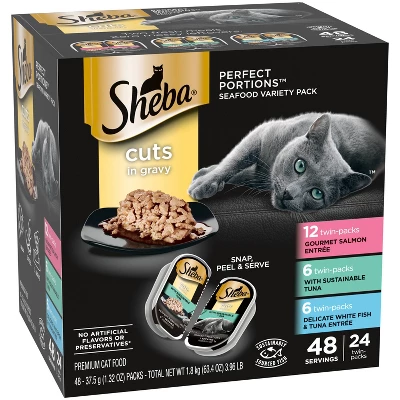 Your cat knows what they want, and knows how to get it. Give them SHEBA Wet Cat Food. Each SHEBA Wet Cat Food Pate recipe is made with real protein, essential vitamins, and minerals, so it’s as nutritious as it is delicious. This wet cat food is made without corn* and artificial flavors or preservatives; and since it’s so delectable and easy to chew, your cat will devour every tasty bite. SHEBA PERFECT PORTIONS Patés offer two convenient servings in each tray to ensure freshness without leftovers. Show your cat some love; whether your fancy feline is a kitten, adult, or senior cat, this soft wet food is sure to satisfy even the pickiest appetite. Savor every delicious moment with SHEBA Wet Cat Food: What Cats Want.