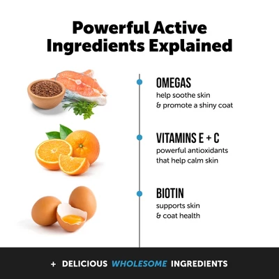 Pet Honestys Skin + Coat Health for cats is a delicious supplement that helps calm and soothe skin, so they can feel more comfortable as they pounce & play! Powerful ingredients like Omegas, Vitamins C + E, and Biotin work together to provide advanced skin & coat support, soothe & nourish your cats skin and promote a healthy, shiny coat. The unique texture format pairs a crunchy outer shell with a creamy, savory filling, offering a taste and texture combination that 9/10 cats love.* It’s a simple way to boost their skin health and help them feel their best, in a format more palatable than the common, messy fish oils.*Based on a 2023 feeding studyGive 1 chew per 1LB of body weight. For kittens 4-6 months, give half a dose. Consult your veterinarian for kittens under 4 months.
