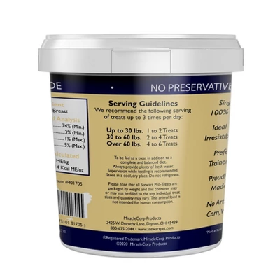 Reward your well-behaved pooch purely and simply with Stewart® Pro-Treat® Freeze Dried Chicken Breast Treats for dogs. These savory, real meat chicken dog treats are freeze-dried to retain their naturally enticing aroma, delectable chicken flavor and wholesome nutritional value. Conveniently sized and highly palatable, Stewart® Pro-Treat® single ingredient, gluten free dog treats are ideally suited for the pup with food allergies or sensitivities. In addition to being the perfect training treat, they can also be sprinkled over your dogs’ regular kibble for added variety or to help entice a picky eater. When it comes to treats, we know that peace of mind is important. Chicken breast is high in protein, low in fat and contains zero carbohydrates. It is also an excellent source of Calcium, Phosphorus, Potassium, Niacin, Vitamin B6, Iron, Zinc and Selenium. Stewart® Pro-Treat® are proudly made in the USA, without additives or preservatives, in a USDA inspected facility. Stewart® all natural dog treats are simply the best healthy dog treats you can buy.