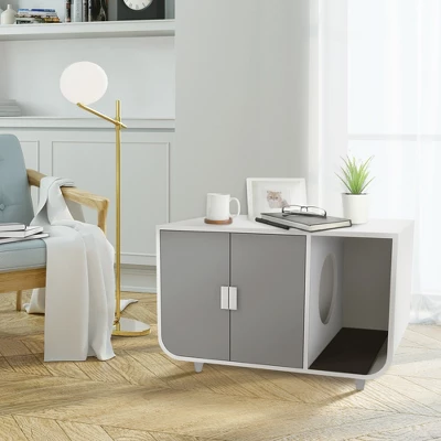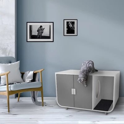 - MODERN LITTER BOX: Features a classic mid-century design with a white finish and gray accents for a modern addition to any space.