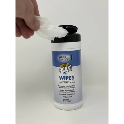 Keep your pet’s ears, paws and butt clean, moisturized, and conditioned with Urine Gone Pet Wipes. Wipes are the convenient and ideal product for removing odor, grime, feces, urine, saliva, paw perspiration and dander between baths. Wipes are PH balanced, paraben and alcohol free and contain natural aloe vera and oatmeal extract to sooth sensitive areas and help prevent irritation and cracks that can lead to infections.